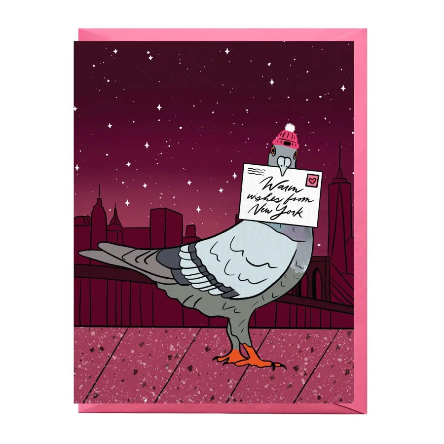 Send warm wishes from New York City with this charming pigeon mail carrier. Card reads "Warm Wishes From New York" and features a pigeon wearing a beanie in front of a New York City skyline. Printed on 100% recycled paper and paired with a coordinating envelope. Blank inside and sealed in a protective cellophane sleeve. Size A2 (4.25" x 5.5"). Card reads "Warm Wishes From New York" and features a pigeon wearing a beanie in front of a New York City skyline.