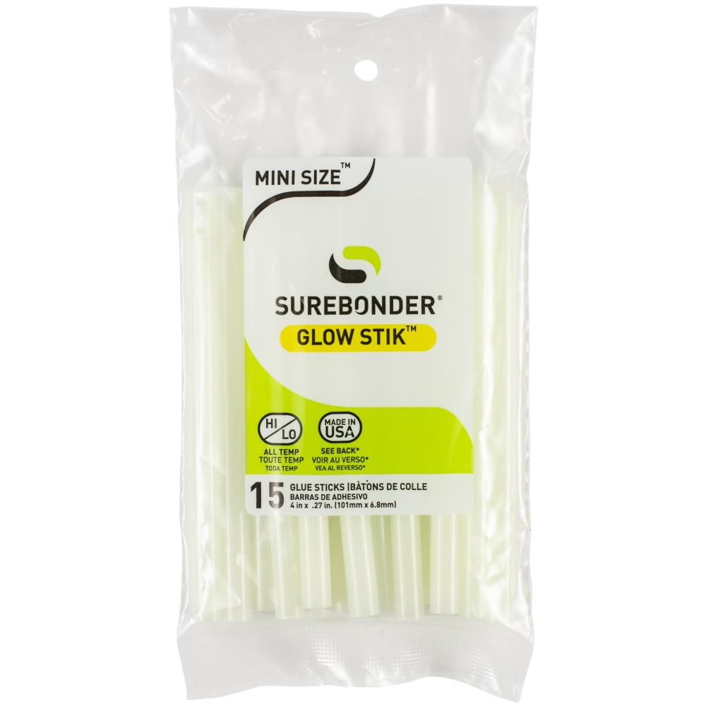 Surebonder Glo Stik is a glow-in-the-dark glue stick, great for all kinds of Halloween, craft, art, and school projects! This package contains fifteen mini glue sticks for use in high, low, or dual temperature mini glue guns. Each one is 4 inches long with a diameter of .27 inches. (101mm x 6.8mm). Made in USA.